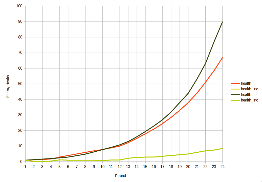 To illustrate the kinds of tedious changes I've been making to the balance of the game, I've included the graph below. It shows the enemy health scaling based on rounds. The orange curve is the old scaling and the black one is the new one. This change made the game much easier to pick up and more interesting to play lategame in general, but was very tedious to get to because I had to constantly test and iterate on the game.