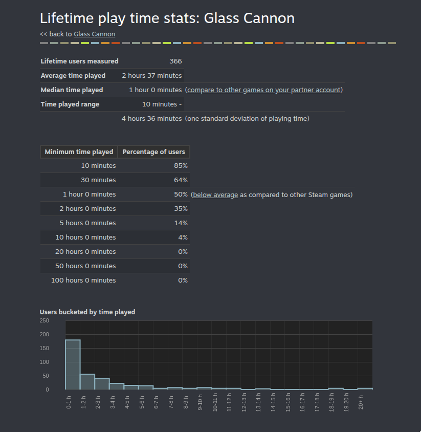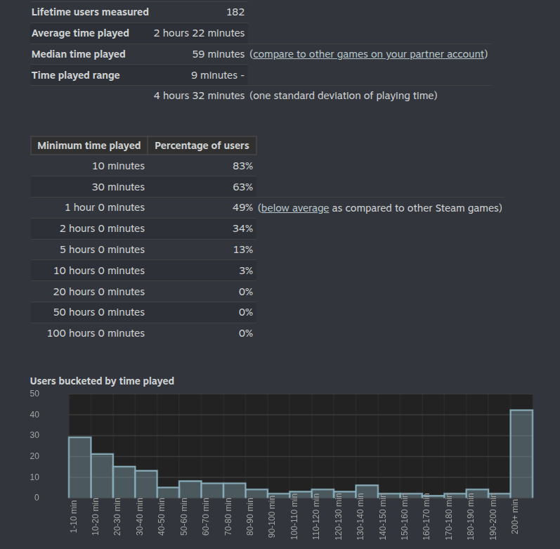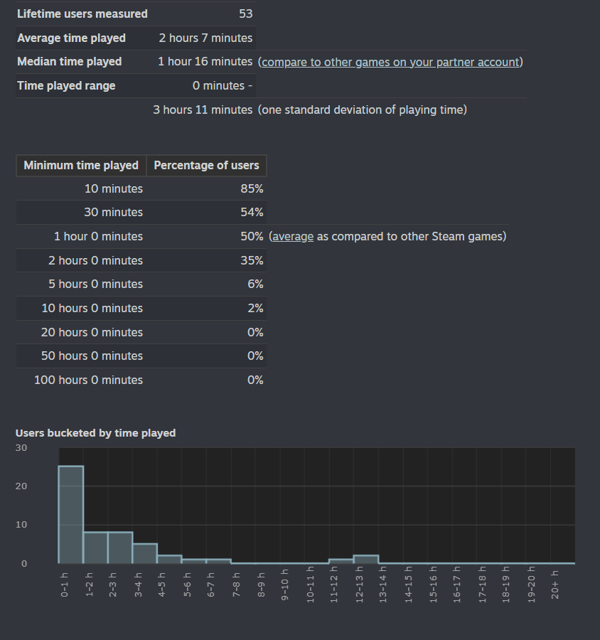 Steam won't show me a zoomed-out bucket graph by hours when the median playtime is lower than 60 minutes, so it's a bit harder to tell, but since the most significant 'minimum time played' brackets went up, Steam has taken notice. I'm especially thrilled that the 5h bracket increased by 7%.