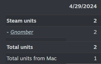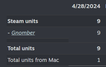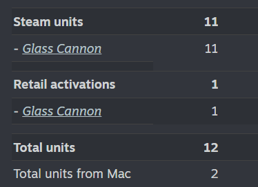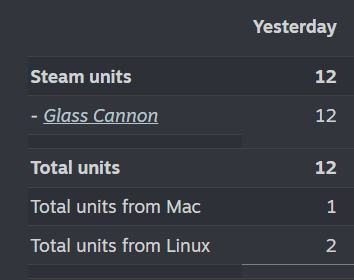 Definite improvement over Gnomber: 11 vs 2. Ignore the 1 retail activation, that's a free key I gave out. Glass Cannon keeps people interested for longer, so the higher number makes sense. Doing more daily comparisons after this doesn't make sense because Gnomber's numbers basically oscillated between 2-3 sales a day until May 12th 2024 where a small youtuber covered it and it got 123 sales on that day alone.