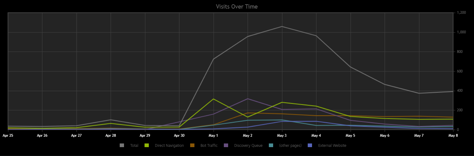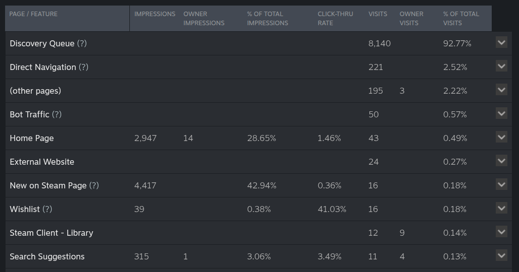 Most of the traffic is coming from steam itself through the discovery queue, a whopping 92%. Here is a breakdown of the traffic from May 15th to May 17th (the latest date I can specify):